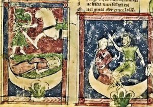 Meanwhile Jaufre, weighed down by his armour, travels quickly through the water and finds himself in another world below the water. There is a lot to say about fairies inhabiting wells, or fountains, or rivers, and sometimes enticing men into the water for various purposes, and there are folktales from various cultures about a land under the water. Some scholars have tried to draw parallels with the fountain in Yvain or the Welsh Owain, but the motif is treated very differently, comes at a different place in the story and there is no underwater world, and so these comparisons are not very helpful. We don’t discover the name of the maiden who has played this trick on Jaufre until later on, but it is worth noting that her land is beautiful and rich, but devoid of people and ravaged by warfare, a little like the forest in which Jaufre had met the demon and the mother of the lepers. She justifies pushing Jaufre into the water by her desperation to find a champion, having been turned away by Arthur’s court and by Jaufre himself. Her enemy is Felon d’Albarua (his name possibly comes from the same root as Oberon), and his villainy is clear from his ugliness, as well as his complete lack of good manners. His wonderful bird, which appears to hypnotise its prey (without the medieval author knowing the word “hypnotise”), might be a reference to a conflict between two barons of James I of Aragon who were ready to fight over a goshawk.