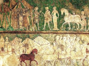 Immediately after Jaufre’s immersion in the water, the narrator presents us with a remarkable selection of funeral elegies, starting with the grief of his horse, and swiftly followed by the seneschal, Melian and Brunissen. Throughout the tale there are numerous depictions of extreme grief, but this is by far the longest passage of mourning and lamentation. Brunissen tries to drown herself, but her pragmatic seneschal pulls her out by her hair (I love this man!). Male grieving, as shown here, is also found in other literature of the time (and earlier), for example in the Chanson de Roland and Beowulf, although it may seem overwrought and unlikely now, but I think that the comic intent within this story is made clear when the horse is the first one to be affected. There is some good poetry in the elegies, although of course the listener will already suspect that Jaufre is not, in fact, dead – and then the Archbishop Gales delivers some general hollow platitudes. Melian eventually suggests that they send a message ahead to Arthur, who is bound to know what to do as he has had adventures!