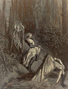 This is a fascinating piece of storytelling on a number of levels. The setting is an enormous lush and beautiful meadow (reminding the listener of Brunissen’s orchard and garden), with a “fountain” or spring at one end. It is hard to tell whether this is a natural spring with a pool, or something more architectural (in which case we have no idea who might be responsible for it). The entourage are busy setting up tents for the night when a woman’s cry for help is heard, reminding the listeners of Arthur’s adventure at the start of the tale, and, just like Arthur, Jaufre resolves to go and see what is wrong. And is pushed into the water, with a definite sense of slapstick rather than heroism. The image below is an engraving by Gustav Doré from “Les Aventures du Chevalier Jaufre et de la Belle Brunissende” by Jean-Bernard Mary-Lafon (1856), while the image below that is from the late 13th century manuscript in the Bibliothèque Nationale. Neither are particularly realistic!