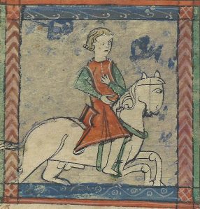 This episode, rather like the last one, is a stand-alone adventure and has no real importance to the main storyline. It’s also quite short, as you will have heard. The main adversary is a highly unpleasant character who seems to have no real purpose in life except to attempt to extort horses and armour from passing knights. He’s quite clearly not, himself, a knight, as he has no horse, quite apart from his distinctly unchivalric method of fighting. He has, on the other hand, acquired horses from the 25 knights he’s imprisoned, and he wants to ensure that Jaufre’s horse isn’t hurt in the fight. In the original text, he’s referred to as a “sirvens” or “serventz”, and this might be translated as a servant, a man-at-arms, or a mercenary soldier. Contemporary accounts use the term “sirvens” for generally anti-social individuals, responsible for such crimes as pillaging, murdering, holding victims to ransom and bullying. I’ve used the term “ruffian” to try to encapsulate all of this. His actions (high leaps taking him from side to side of the narrow canyon) and his weapons (three impossibly strong and sharp darts) suggest that he may be magical in nature, but he is not immortal and can be defeated.