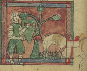 There are many resonances in this chapter and features that can be found in many other medieval and pre-medieval stories. The garden which seems like Paradise is just one, but those familiar with the Welsh Mabinogion will think of Rhiannon and her singing birds, and those who know Chrétien de Troyes’ “Perceval” will think of his hero, lost in a reverie about his love and dreamily doing battle with various knights while only half-conscious. Brunissen, though, is not Rhiannon, and Jaufre is not in love (at this point) but seriously tired to the point of almost falling off his horse. What I love about this episode is the way in which the author switches from Brunissen and her temper tantrum to Jaufre and his complete befuddlement. It needs very little treatment to see it as a modern film sequence.