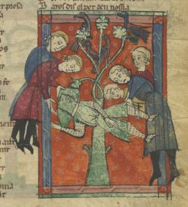 Jaufre is also shown in very human terms, rather than as a stereotyped hero. He is too sleepy to take in what’s happening and is fully convinced that just one man keeps breaking his promise and waking him up. He really can’t understand why there’s all this annoyance when he’s not stealing anything or destroying anything. He thinks the men must be demons or ghosts, because who else would be around in the middle of the night, behaving oddly? Of course he was justified in the more violent response to the third time he’s roused from sleep, because the man was clearly wrong to break his word. When he sees Brunissen, it’s love at first sight, and the angrier she is, the more he loves her. She’s threatening to have him tortured and killed and he doesn’t care. She may be surrounded by demons and ghosts, and in the worst mood imaginable, but she is adorable. The narrator also points out that while she is tossing and turning and tormented by love, Jaufre falls asleep immediately – a phenomenon of female/male behaviour (I apologise if this is too binary) which is instantly recognisable in the 21st century. And then to put the tin lid on Jaufre’s confusion, he’s beaten to within an inch of his life because he asks what’s happening, when he’s woken up yet again by the weeping and lamentations. No wonder he thinks they’re all demons.