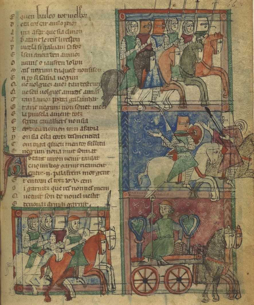 The time has come for Jaufre to meet Taulat. Some scholars have described Jaufre’s progress so far as building up to this point, but he has had no schooling or training in fighting techniques and he has, from the very first encounter, been able to deal effectively with his foes, even if his style can be unorthodox. There may have been a turning point in his battle with the demon in the forest, and he is now certainly more vocal about his mission from God. He has been sent by God in order to punish Taulat’s arrogance, so that a young knight with less than a month’s experience will bring down this ferocious and cruel fighter. Remarkably quickly and easily, in fact.