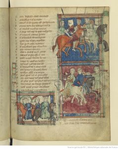 In these two episodes there are a few moments when Jaufre (and indeed Brunissen) say things aloud which are the opposite of what they’re thinking. The narrator lets us know their thoughts, and the result is that there is some humour involved but also a glimpse behind the courtly behaviour and good manners. Augier’s daughter (who is never named) has worked out that although she may be Jaufre’s “maiden” to whom he owes service, she is not the one he loves, and she reproaches her father for his rather heavy-handed attempts at getting Jaufre to stay. How many parents have told their children that you shouldn’t ask for what you know you can’t have? (We hear the opposite of this later on, when Brunissen says that you should always reach out for what you want!) Meanwhile Augier does try to persuade Jaufre that Brunissen has never loved anyone. This isn’t likely to change Jaufre’s mind or put him off, but it gives him something to think about.