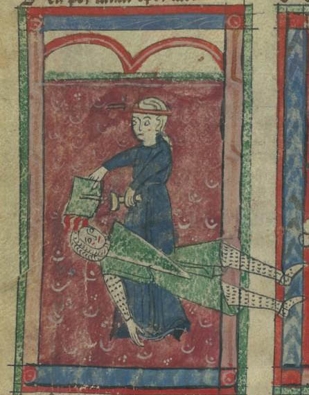 Lepers – this is from a time when leprosy was seen as a punishment from God. Lepers were seen as intrinsically evil, and lecherous. The description of the giant leper is apparently medically accurate, and there was a suggestion that bathing in the blood of the innocent (such as children) could be a cure. The leper who is stealing children has also compounded his evil by making an insulting gesture to Jaufre, whose sense of morality is, as we have seen, very simplistic. Jaufre is, therefore, attacking the giant leper to save the beautiful maiden, and fighting in whatever way he can (modern listeners will of course recognise how this precedes Monty Python), and then attacking the other leper to save the children. Modern listeners find this all difficult, but this was from a different time, and when the maiden tells her story to King Arthur we realise the giant has behaved brutally as well.